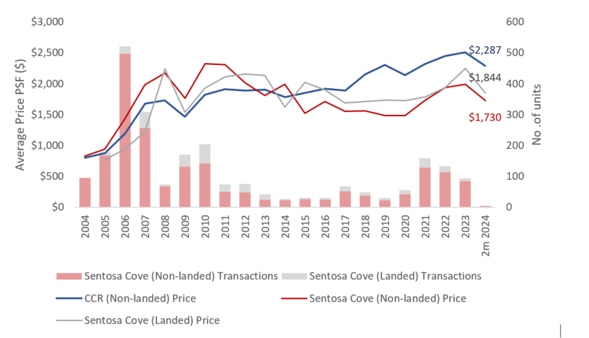 介于2015年至2023年期间,升涛湾平均每年约有764个非有地私宅单位和57栋有地私宅出租。这占了升涛湾总私宅单位量的近38%。升涛湾的非有地私宅租金与核心中央地区(CCR)相当。相比之下,圣淘沙的有地私宅租金一直在上涨,目前已达到历史最高水平。富裕租户寻找海滨住宅愿意支付更高的租金来租赁这些稀有单位。